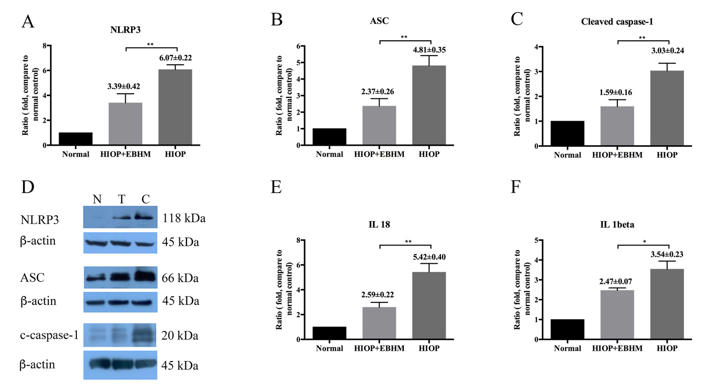 (C) “**” refers to cleaved caspase-1 in HIOP + EBHM group/normal control ratio versus the HIOP model group/normal control ratio,