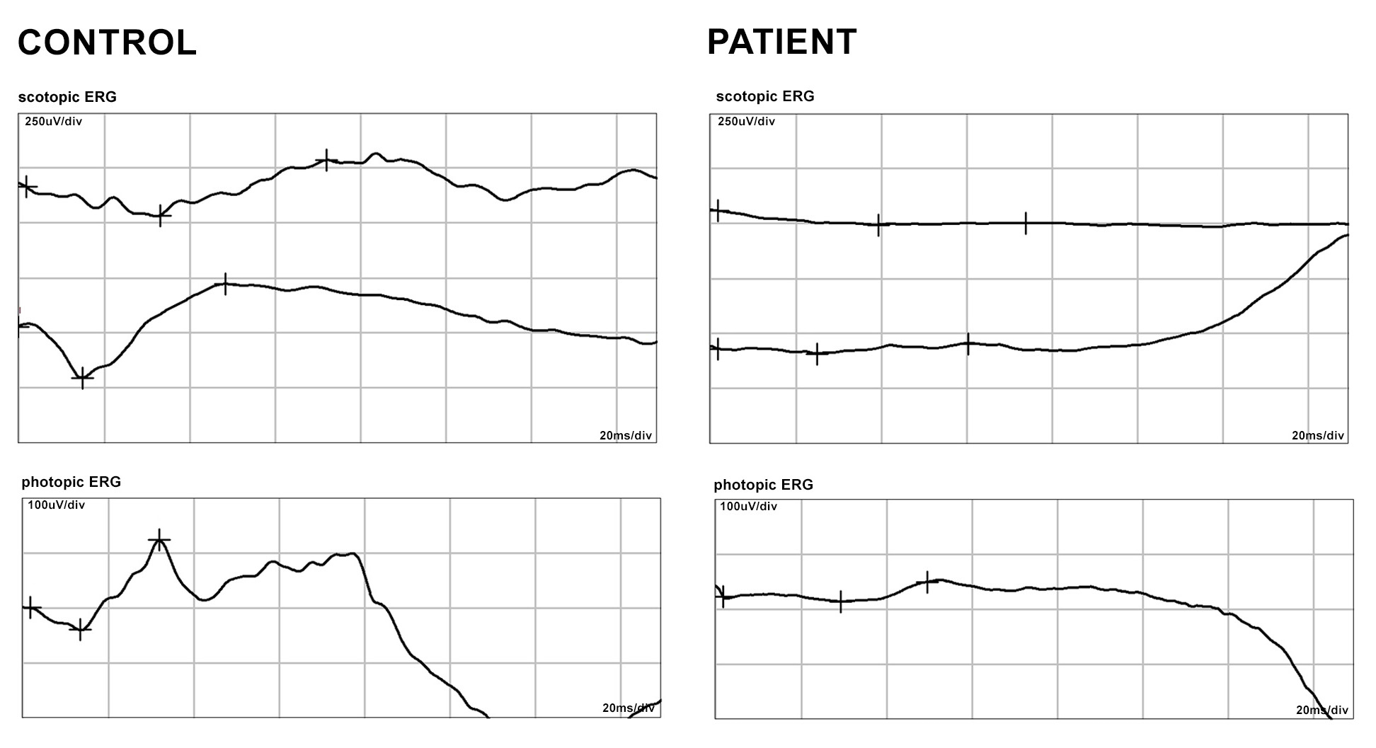 ERG data from a patient with CRD (Family 9). The left panel shows the electroretinograms (ERGs) of a normal healthy individual; the right panel shows the ERGs of the patient, which show the extinguished rod and cone response.