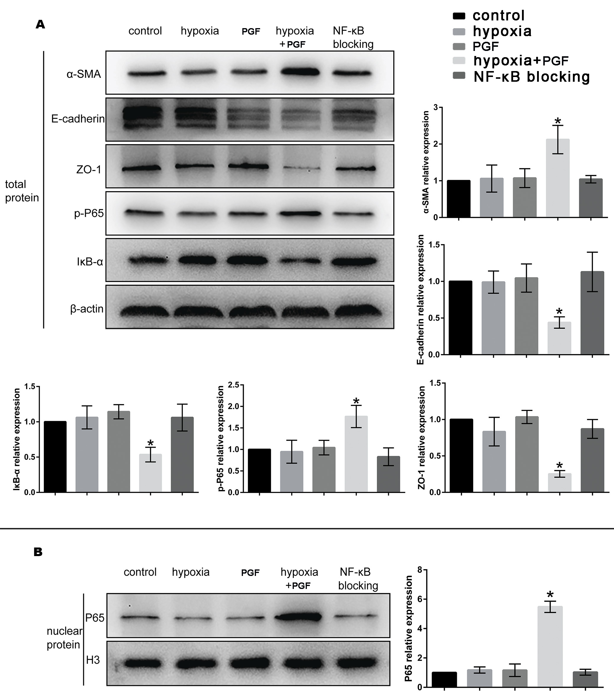 Figure 6. The NF-κB inhibitor counteracts the effect of PGF on the EMT in ARPE-19 cells under hypoxia. A: Representative protein blots of α-SMA, E-cadherin, ZO-1, p- p65, and IκB-α in the total protein and semiquantitative analyses
