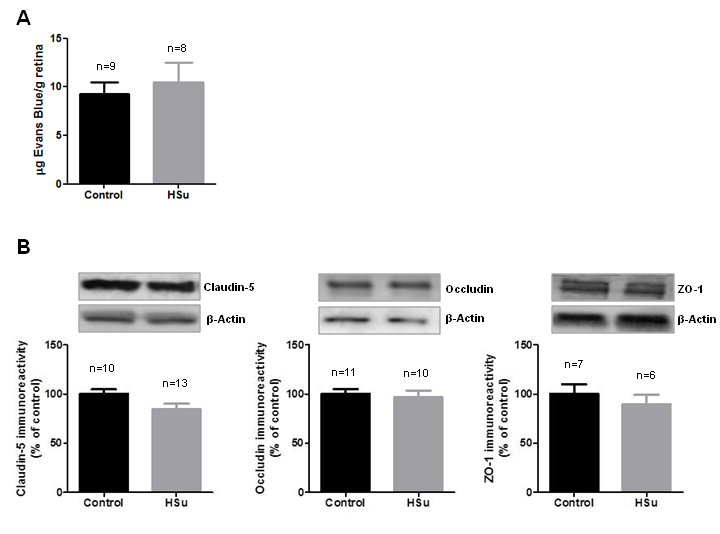 Figure 1. Chronic HSu treatment does not affect tight junction proteins and BRB permeability in the retina. A: The permeability of the blood–retinal barrier (BRB) was assessed with the Evans blue dye method. The results are expressed