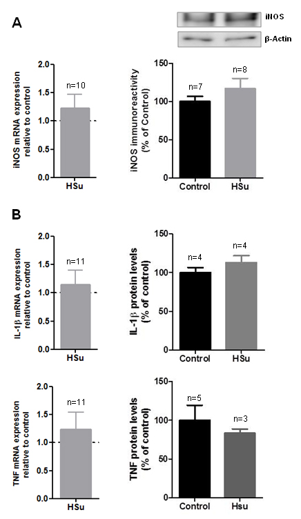 Figure 4. HSu treatment does not induce a proinflammatory state in the retina. A: The mRNA levels of inducible nitric oxide synthase isoform (iNOS) were assessed with quantitative PCR (qPCR). The results