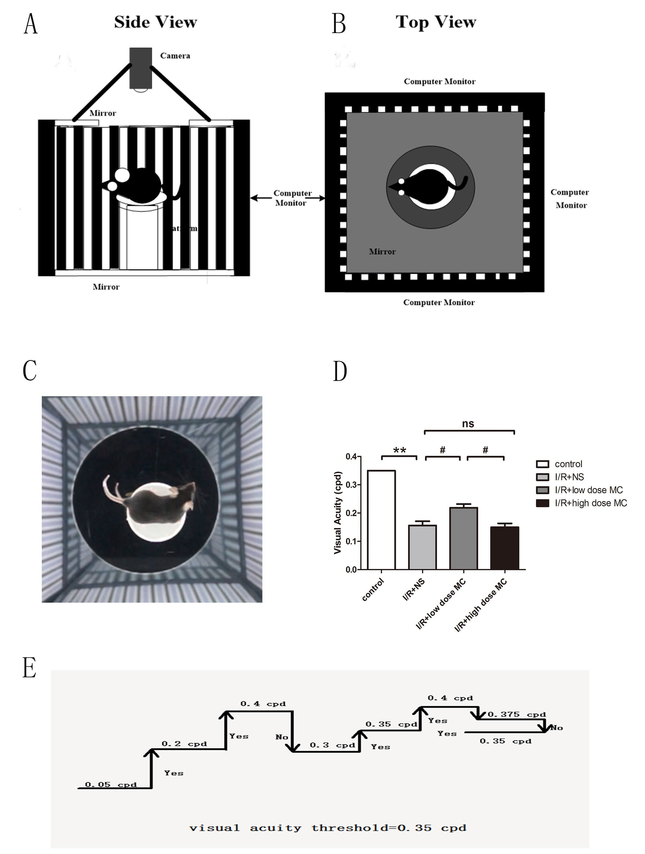 Figure 4. Minocycline (MC) treatment improved optokinetic responses. A, B: Diagram illustrating the optokinetic testing apparatus. C: Video camera image of a mouse tracking the grating. D: Simple staircase method of measuring the visual acuity threshold in the optokinetic test (n=8). E: Histogram of visual acuity. #p<0.01, **p<0.005.