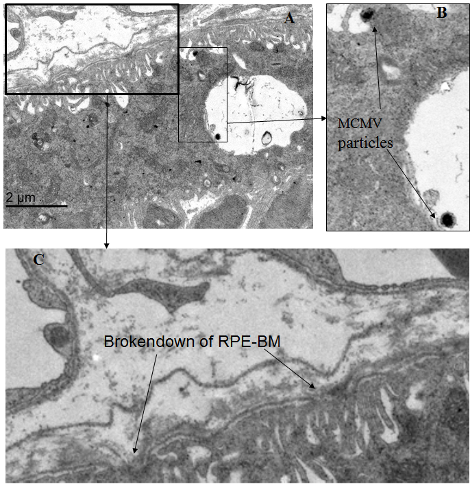 Figure 2. Representative electron microscopic images in eye from a MCMV-infected immunosuppressed mouse at day 10 post-infection. A: Virus particles in the enlarged vesicles of RPE cells directly beneath disrupted Bruch’s membrane. B: Virus particles in enlarged vesicles of RPE cells (arrows). C: Disrupted RPE-BM (arrows).