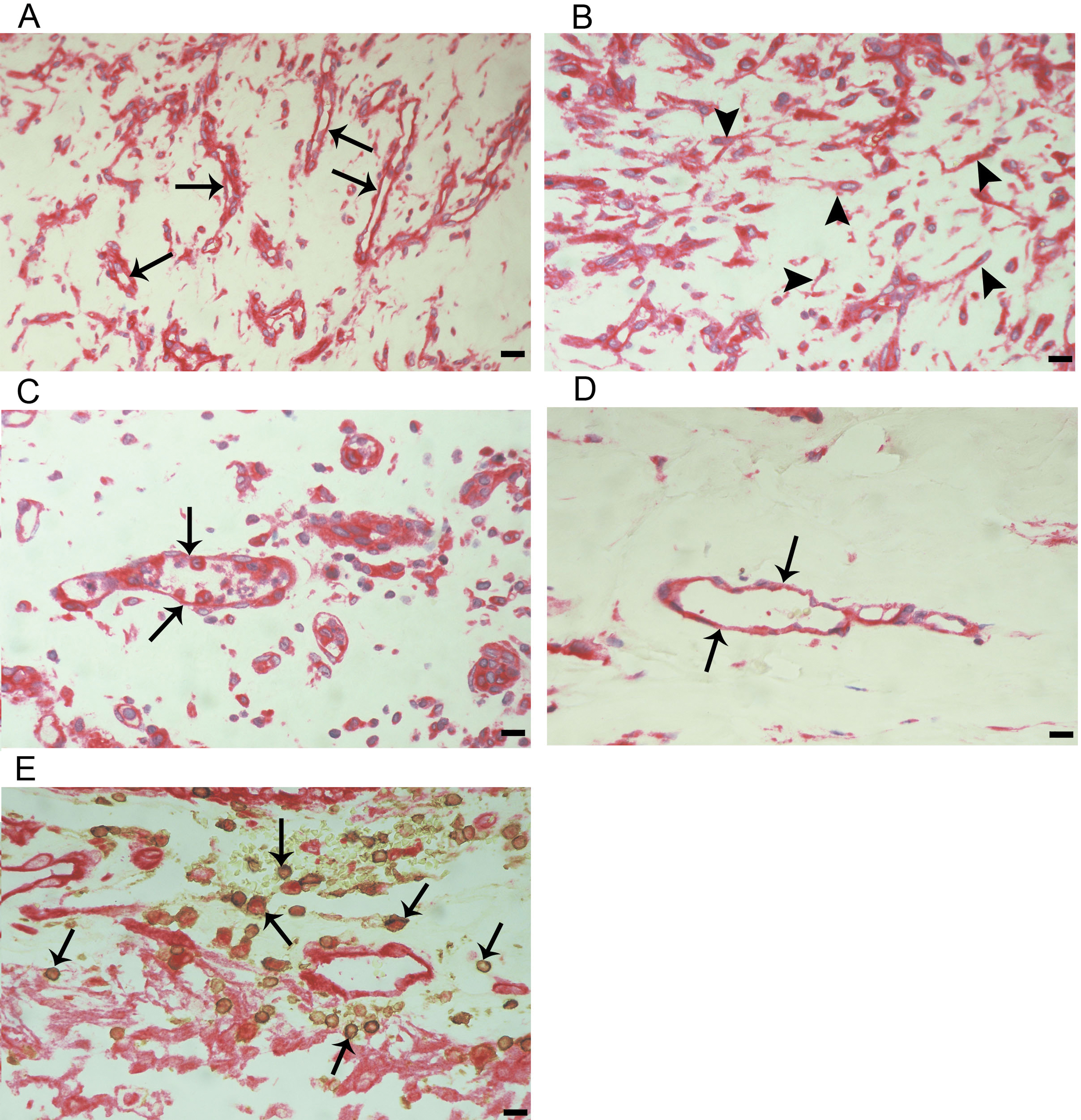 (MMP-14) showing immunoreactivity in the vascular endothelial cells (arrows), in intravascular leukocytes, in stromal cells,