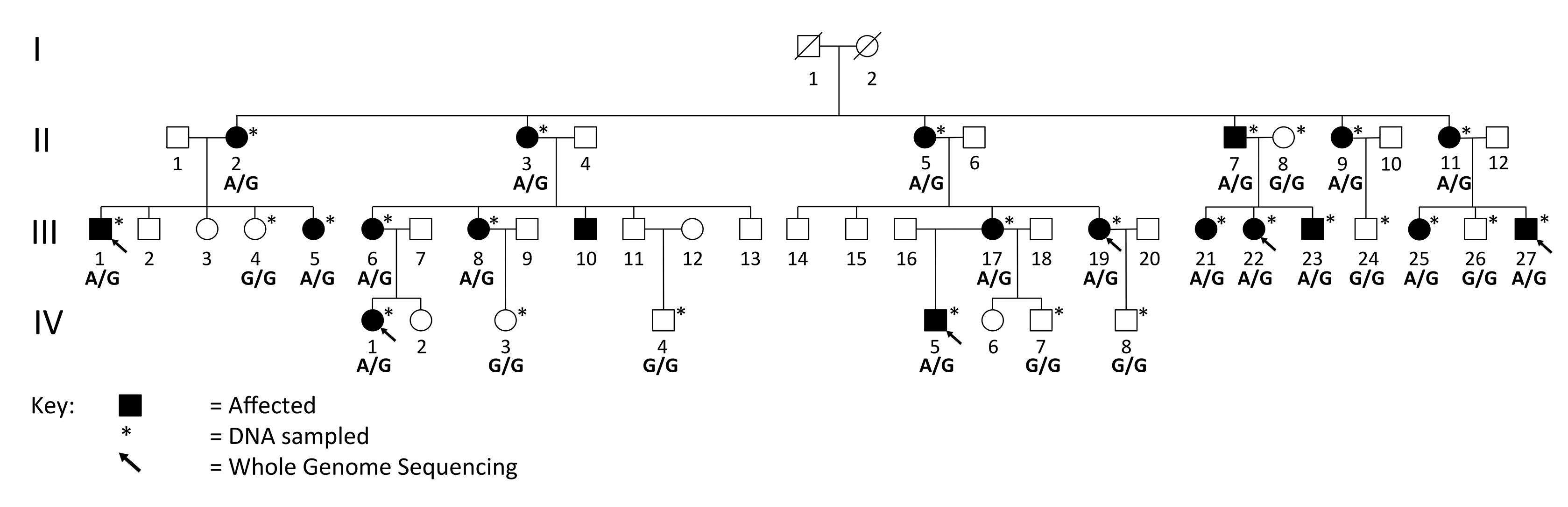 Figure 1. Family pedigree. Family pedigree illustrating the affected individuals, those who had DNA sampled, the six family members