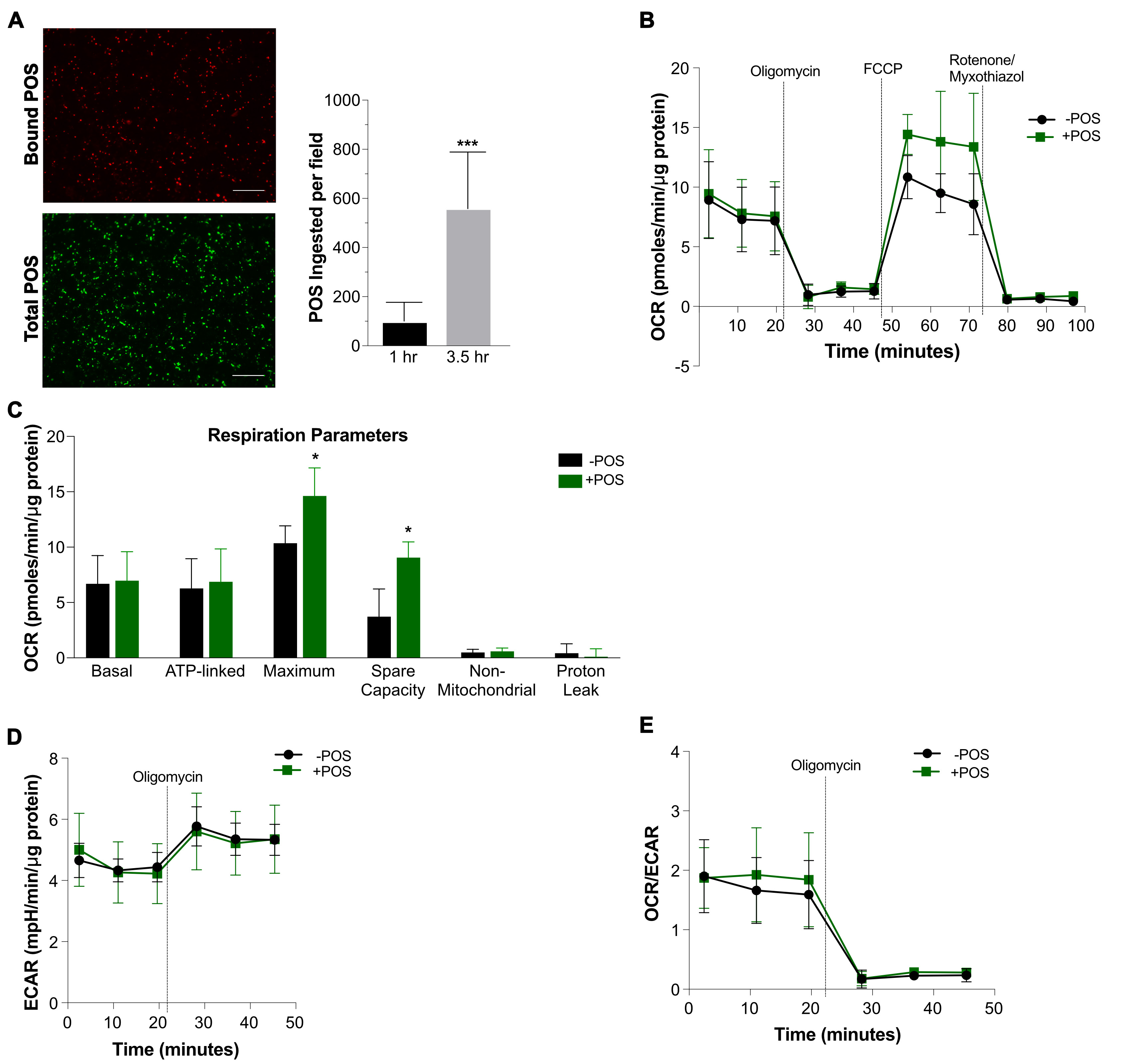 Figure 4. Increased maximum respiration and spare capacity of hfRPE cells exposed to bovine POS. A: Representative 20X field images of bound (red) and total (green) POS at 3.5 h, and quantification of ingested photoreceptor