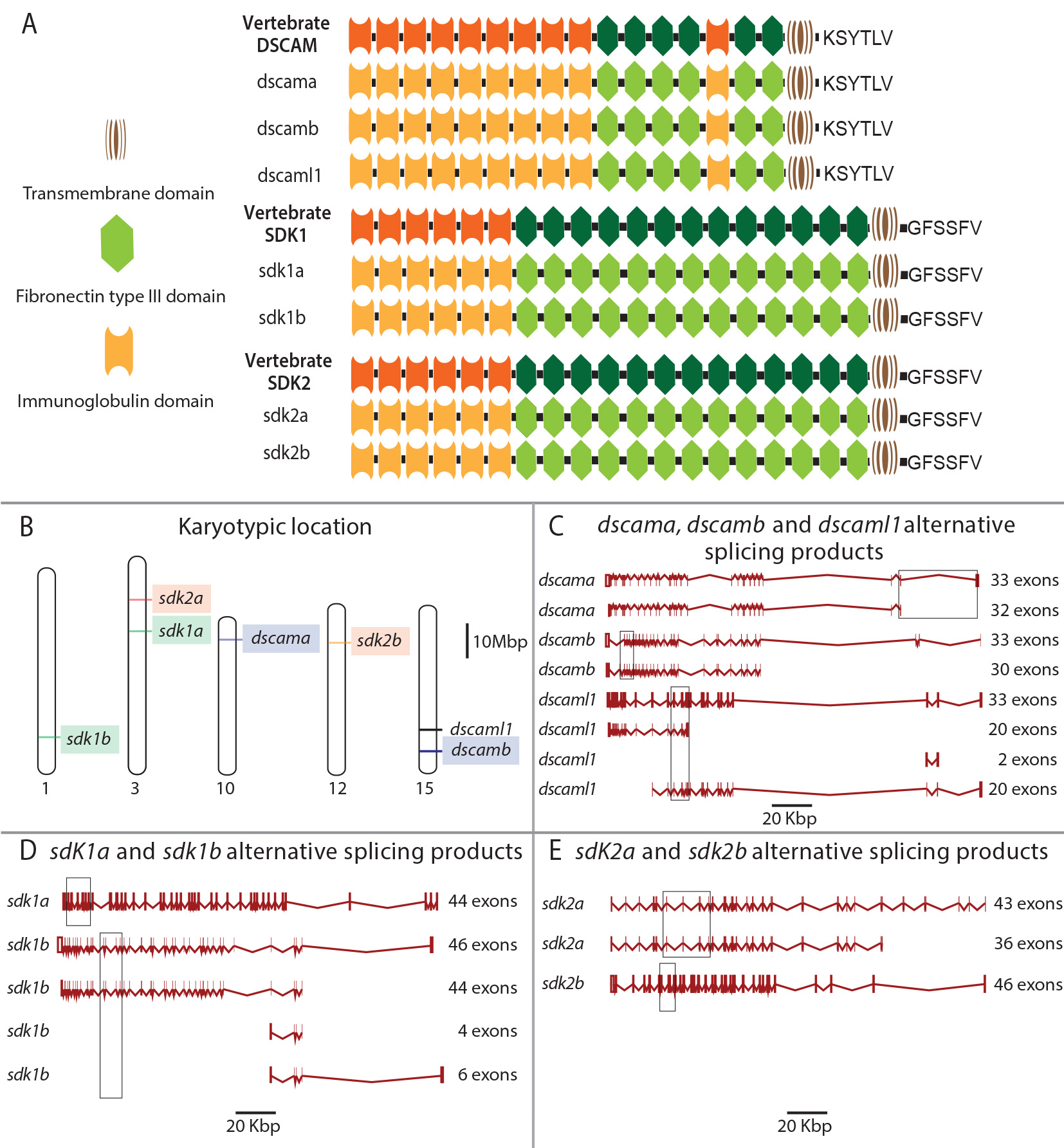 Figure 1. Comparison of the protein and gene structure of vertebrate Dscam and Sdk genes. A: The combination of domain structures for zebrafish Dscama, Dscamb, Dscaml1, Sdk1a, Sdk1b, Sdk2a, and Sdk2b proteins as predicted