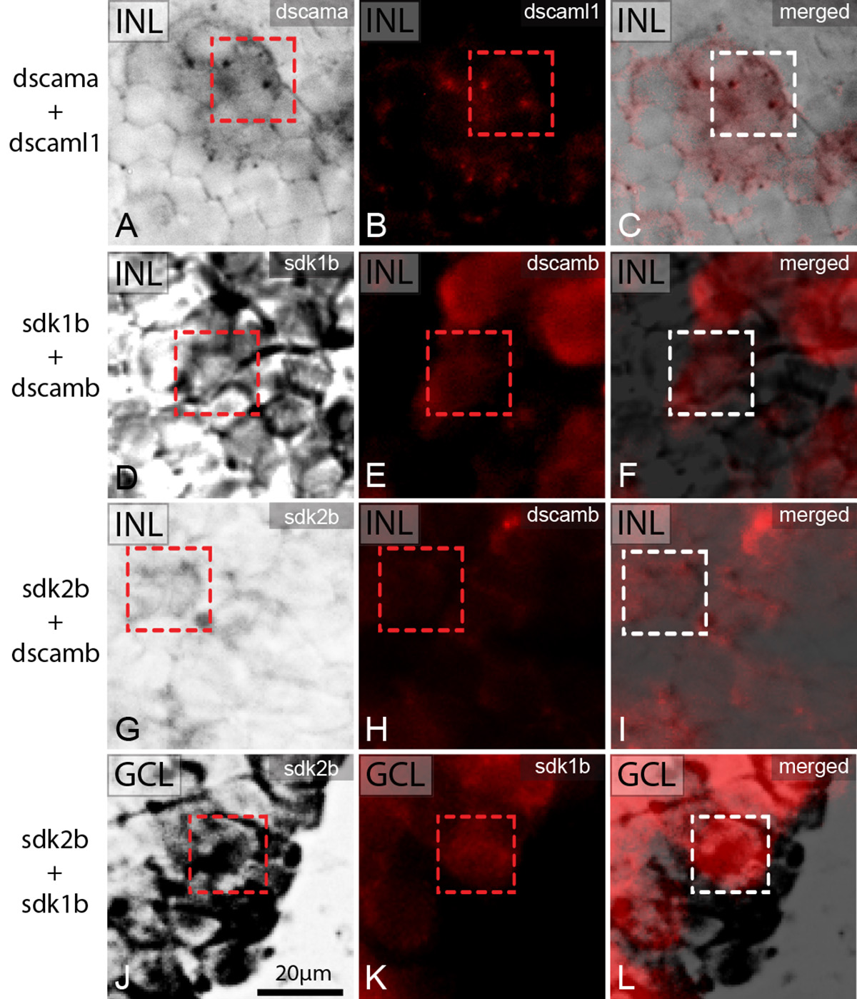 domains of CAM genes. A) dscama and B) dscaml1. C: Merged image reveals some co-expression within the INL (boxed region). D: sdk1b is expressed in a subset of cells within the basal INL. E: dscamb was also observed in the basal INL. F: The merged image shows some overlap in expression (boxed region). G: sdk2b expression was observed within the INL (boxed region). H: dscamb transcripts were also observed in the INL, and I: merging the two reveals low levels of co-expression (boxed region). J: sdk2b is expressed in a subset of cells within the INL. K: sdk1b expression is also observed in cells in the INL. L: The merged image reveals that some overlap exists between cells positive for both. For all comparisons, we observed a mosaic