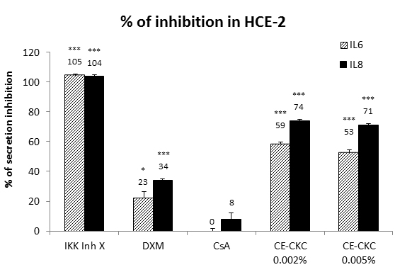 Figure 2. Effects of the cationic emulsions of cetalkonium chloride (CE-CKC) emulsions, IKK Inhibitor X (IKK Inh X), dexamethasone (DXM),