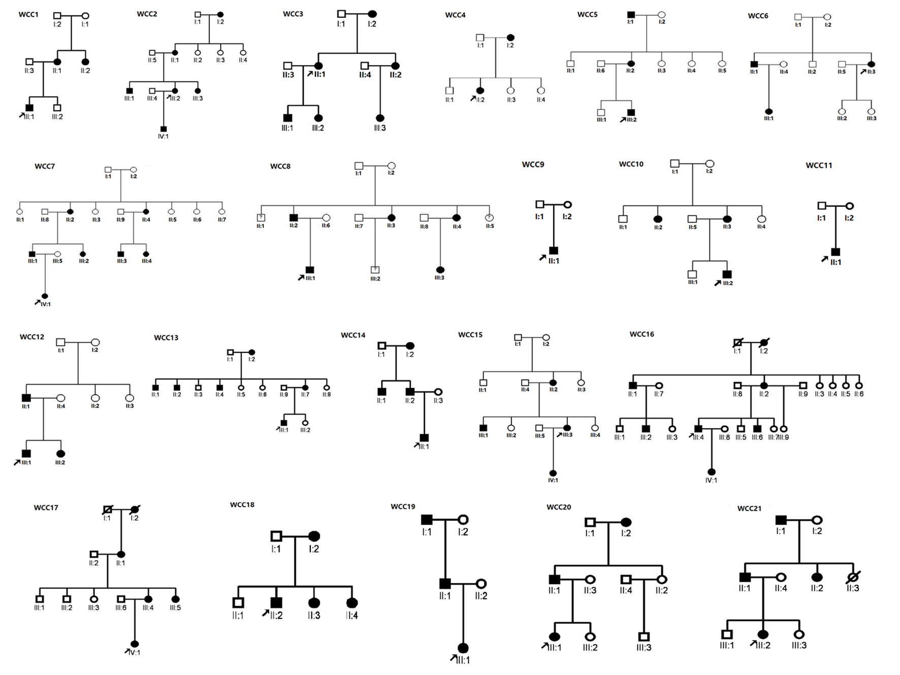 Pedigree of 21 families with congenital cataracts in this study.