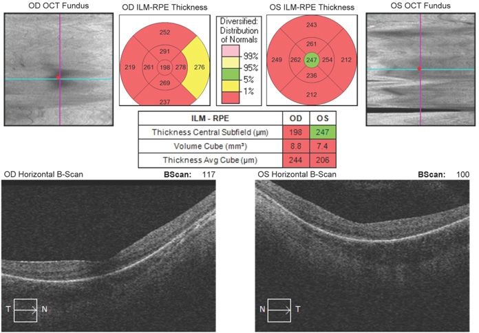 Optical coherence tomography showing severe thinning of the macula in both eyes at age 12 years, as demonstrated by the thickness being less than 1% of normal distribution (red) for both eyes.