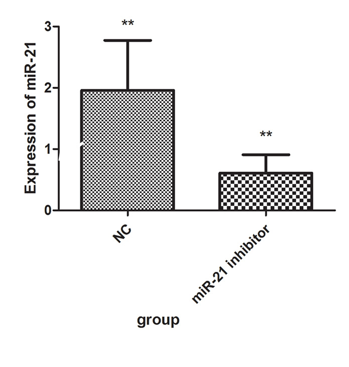 After HPF cells were transfected with miR-21 inhibitor for 24 h, the expression of miR-21 was statistically significantly suppressed compared to the negative control (NC). **p<0.01.