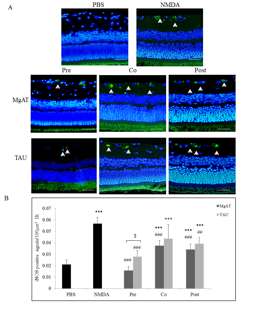 blue fluorescence shows retinal nuclei stained with 4′,6-diamidino-2-phenylindole (DAPI). Scale bar represents 50 μm. B: Quantitative estimation of the effect of MgAT and TAU on the NMDA-induced increase in the expression of iNOS is also represented