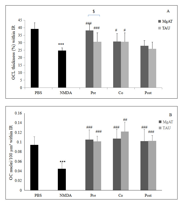 effect of MgAT and TAU on NMDA-induced changes in the thickness of the GCL (%) within IR while the lower panel shows the effects