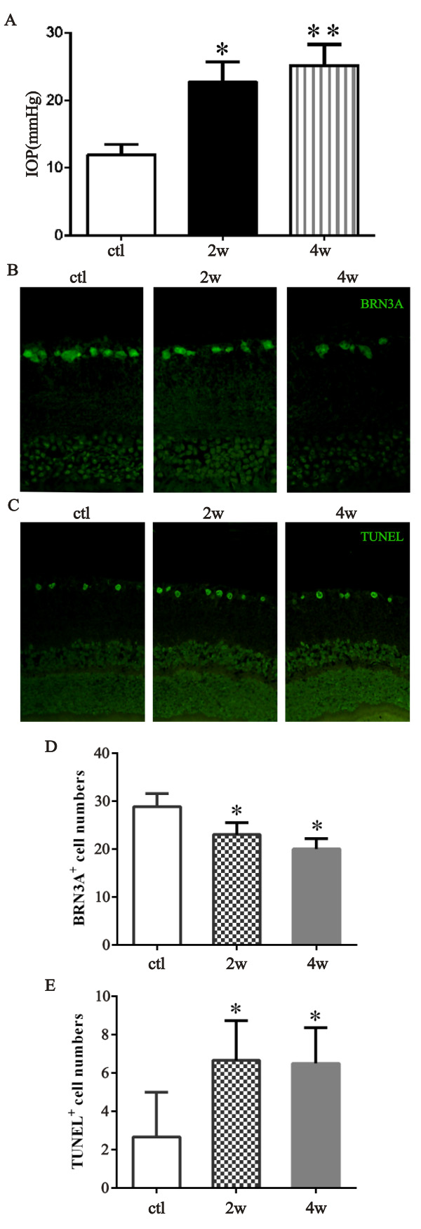 2 weeks, *p=0.037; ctl versus 4 weeks, **p=0.004). B and C: The retinal cross sections were stained with BRN3A or terminal deoxynucleotidyl transferase dUTP nick-end labeling (TUNEL).