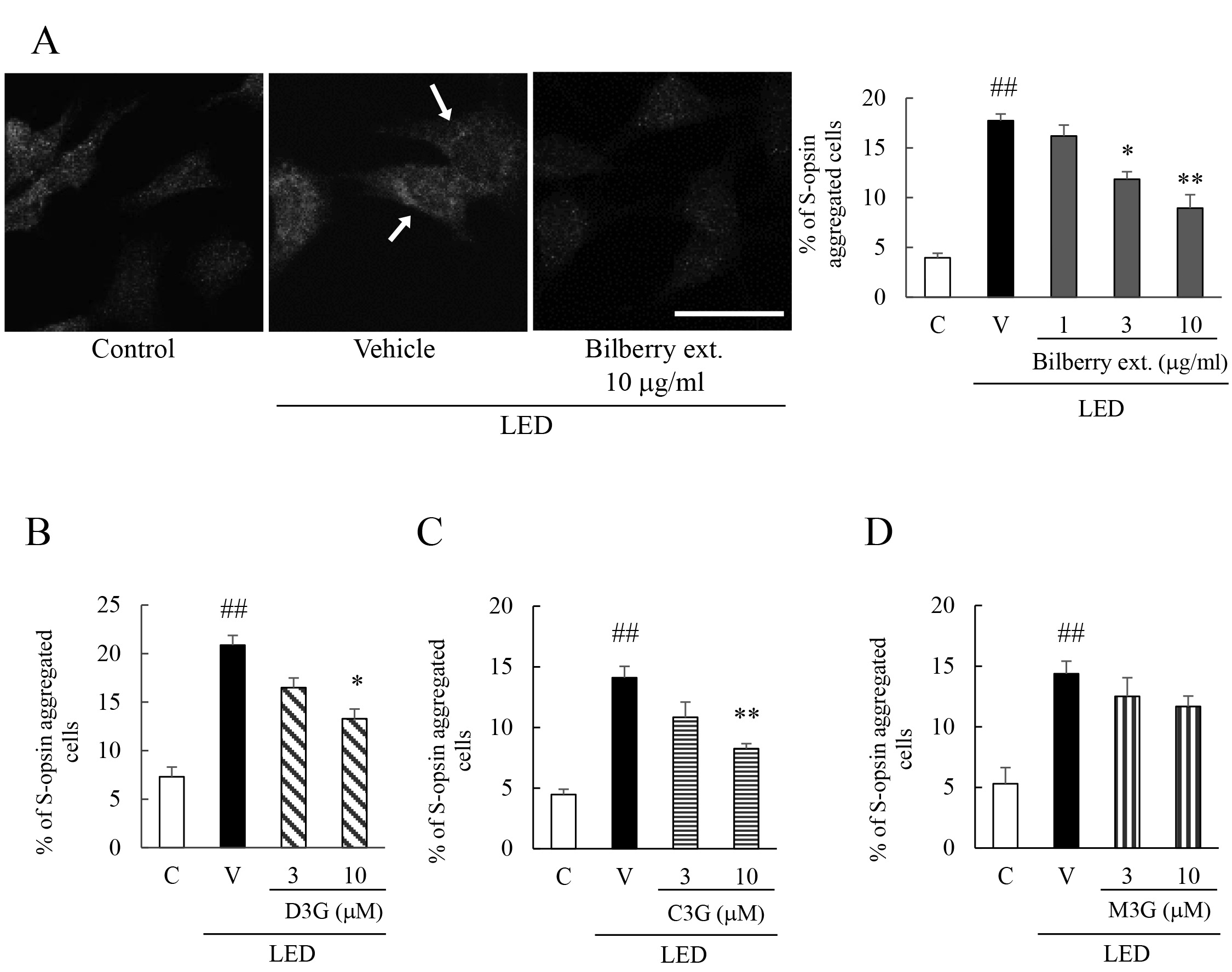 diode (LED) light for 6 h and quantitative data after (A) bilberry extract, (B) delphinidin-3-glucoside (Dp3G), (C) cyanidin-3-glucoside (Cy3G), and (D) malvidin-3-glucoside (Mv3G). The quantitative analysis of the immunostained images is the ratio of the aggregated S-opsin