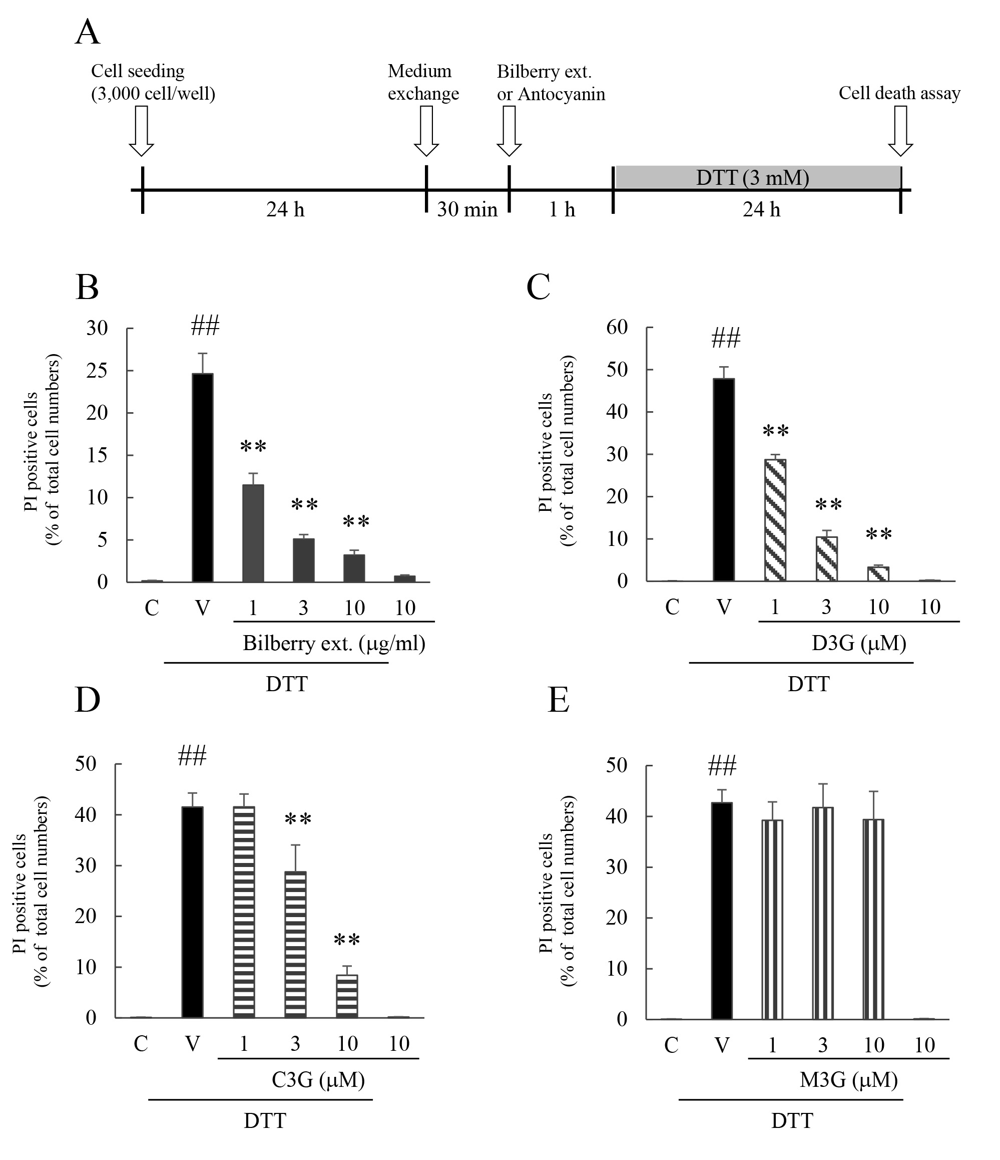 A: Experimental protocol in vitro. Effect of (B) bilberry extract, (C) delphinidin-3-glucoside (Dp3G), (D) cyanidin-3-glucoside (Cy3G), and (E) malvidin-3-glucoside (Mv3G) on dithiothreitol (DTT)-induced cell death in murine photoreceptor cells. The number of cells