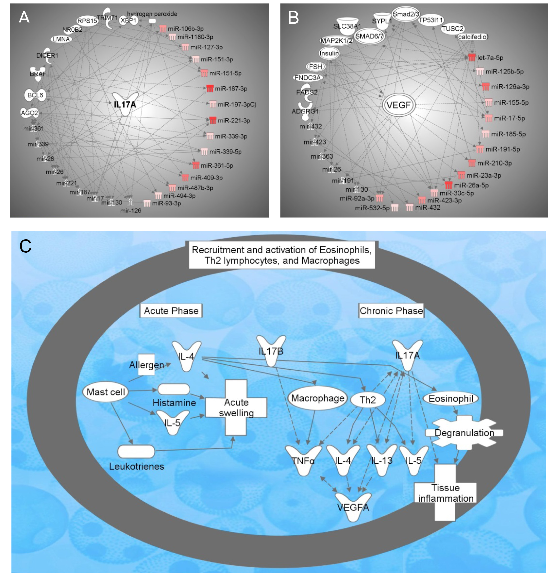Figure 5. Pathway Analysis of the smoke-induced microRNAs and their target genes. A: MicroRNAs and gene network targeting IL-17A: AGO2 (argonaute 2, RISC catalytic component); BCL6 (B-cell CLL/lymphoma 6);