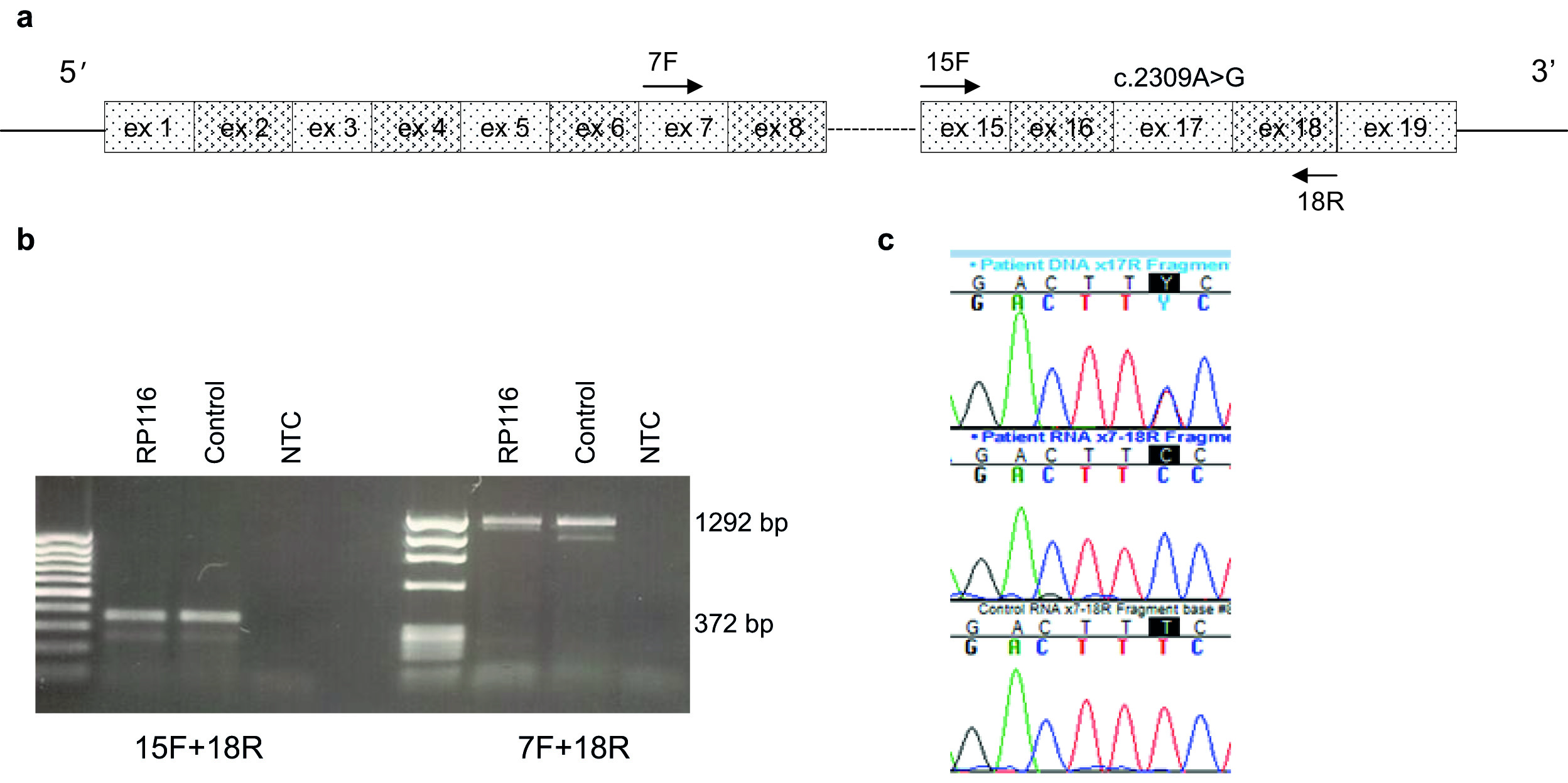 Primers sequences and PCR conditions are described in Materials and Methods and Results. C: Sanger sequencing reveals the presence of the heterozygous c.2309A>G mutation in DNA of RP116 (upper panel), the presence