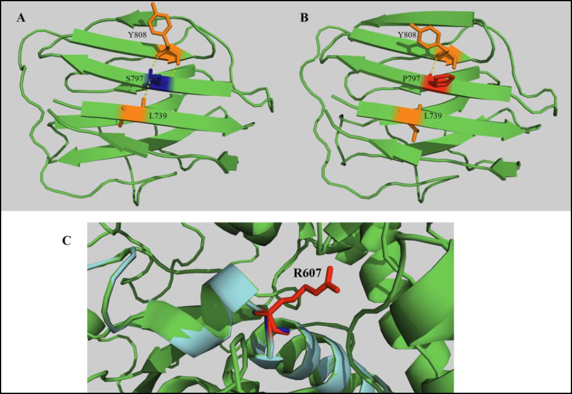 laminin G-339 like domain. Substitution of proline at position 797 (mutant type in red) is conducive to the beta-340 sheet.