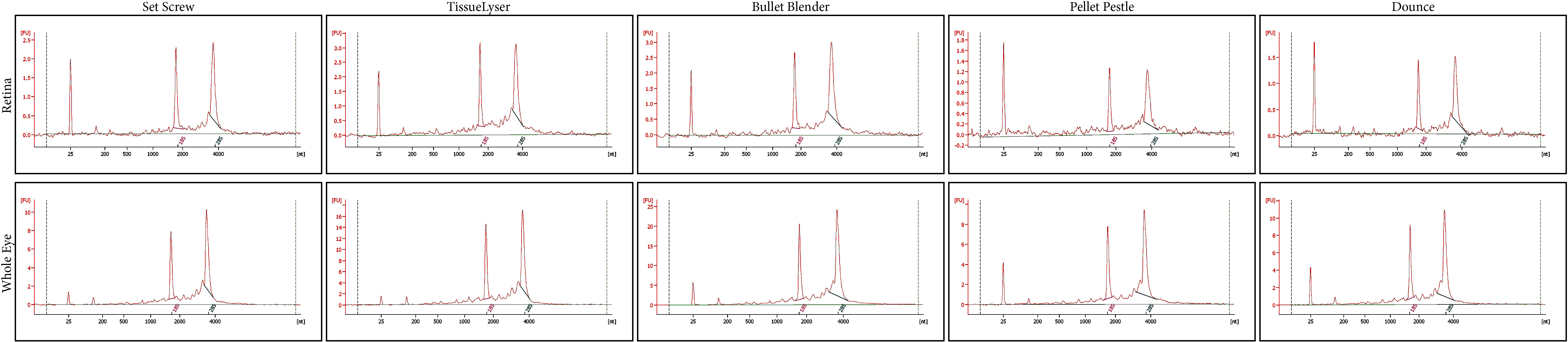 Figure 2. Representative electrophoretic traces from retina and whole eye samples across different homogenization techniques. The first