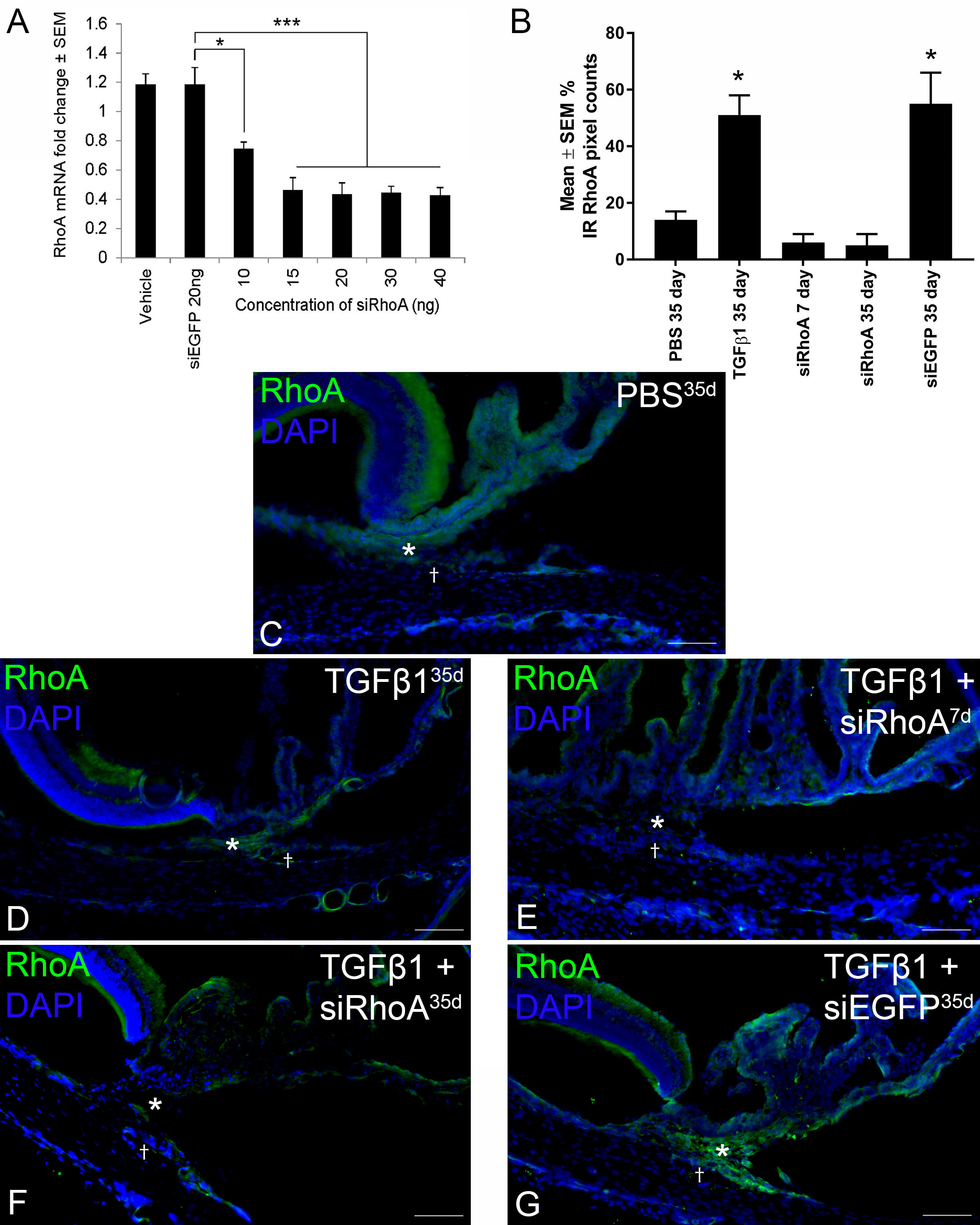 eyes and downregulation after knockdown with siRhoA. Radial rat eye sections immunohistochemically stained for RhoA (green) nuclear counterstaining with 4′,6-diamidino-2-phenylindole (DAPI) (blue) after intracameral (IC) injection with PBS for 35 days (C), TGF-β1 for 35 days (D), TGF-β1+siRhoA for 7 days (E) and 35 days (F), and TGF-β1+siEGFP for 35 days (G). Images were taken of the iridocorneal angle (C–G; *TM;†Schlemm’s canal). Note the successful knockdown of RhoA in the TM of the IC siRhoA-treated eyes (E and F). All images are representative of the eight images taken per treatment group (scale bar=50 µm).