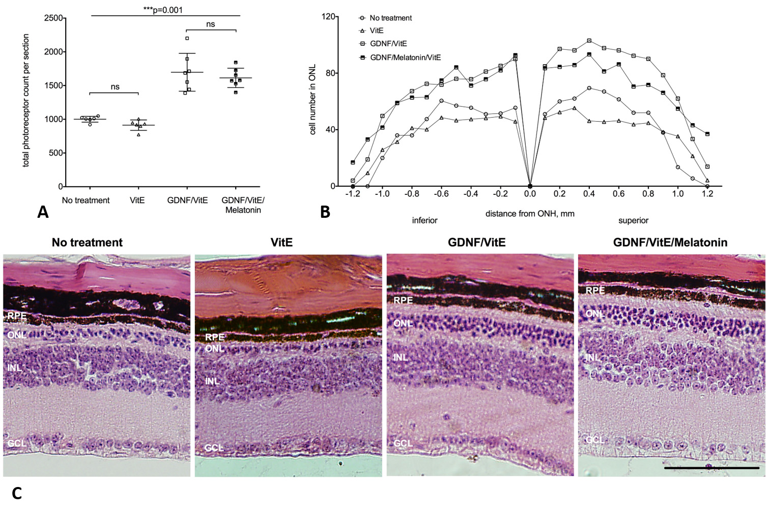 (MSs), GDNF/VitE/melatonin-loaded MSs, VitE-loaded MSs, and untreated rho (−/−) mice. We observed a more than 1.5-fold increase in the photoreceptor number in both treatment groups compared to the