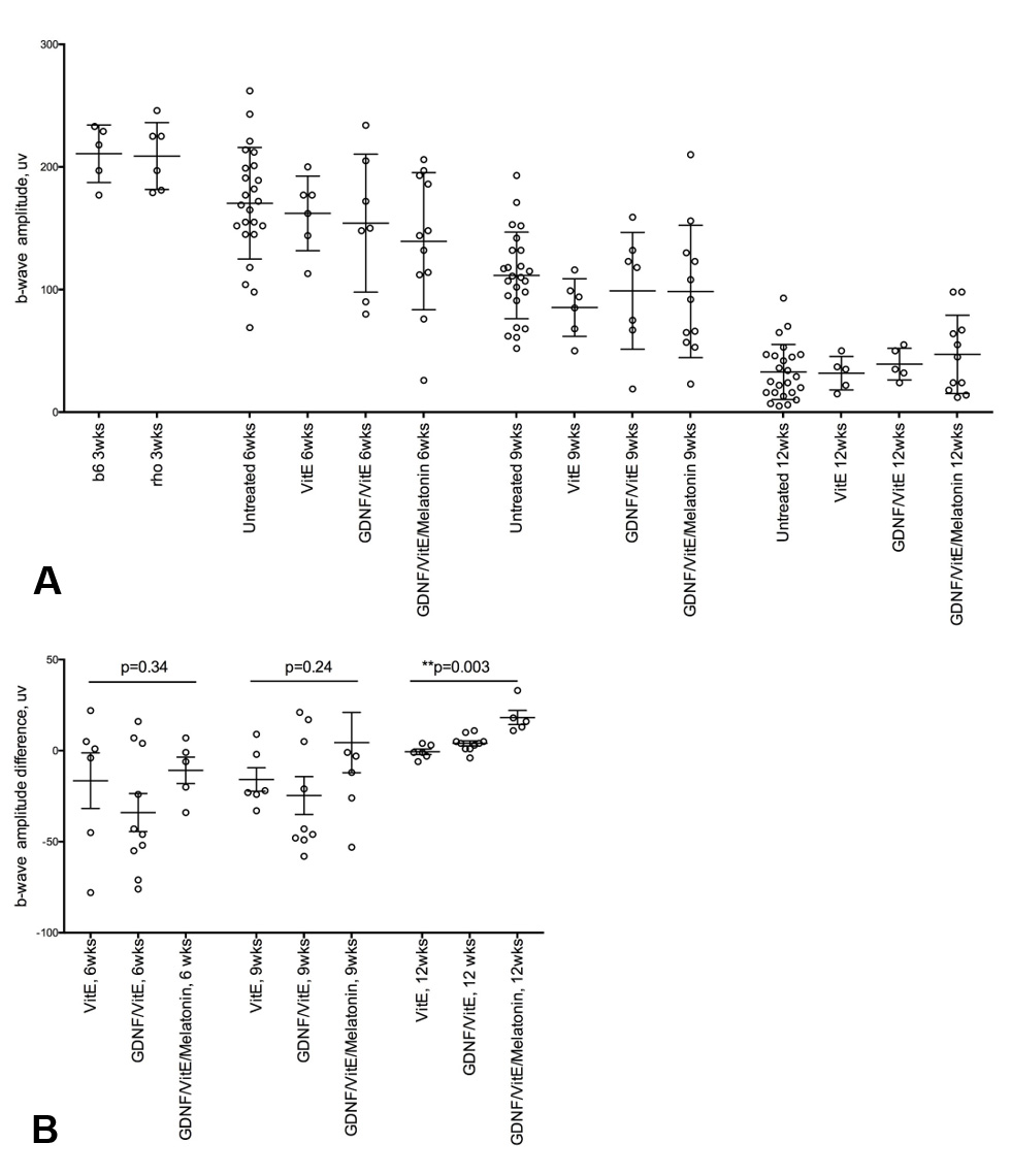 E (GDNF/VitE)-loaded microspheres (MSs), GDNF/VitE/melatonin-loaded MSs, VitE-loaded MSs, and untreated rho (−/−) mice. An averaged electroretinogram (ERG) from a 3-week-old wild-type (wt) mouse and a 3-week-old rho (−/−) mouse is also included. Error bars indicate the standard error of the mean (SEM). B: Comparison of photopic electroretinography recordings from rho (−/−) mice at 6, 9, and 12 weeks after intravitreal injection of microspheres. The amplitude of the b-waves was compared