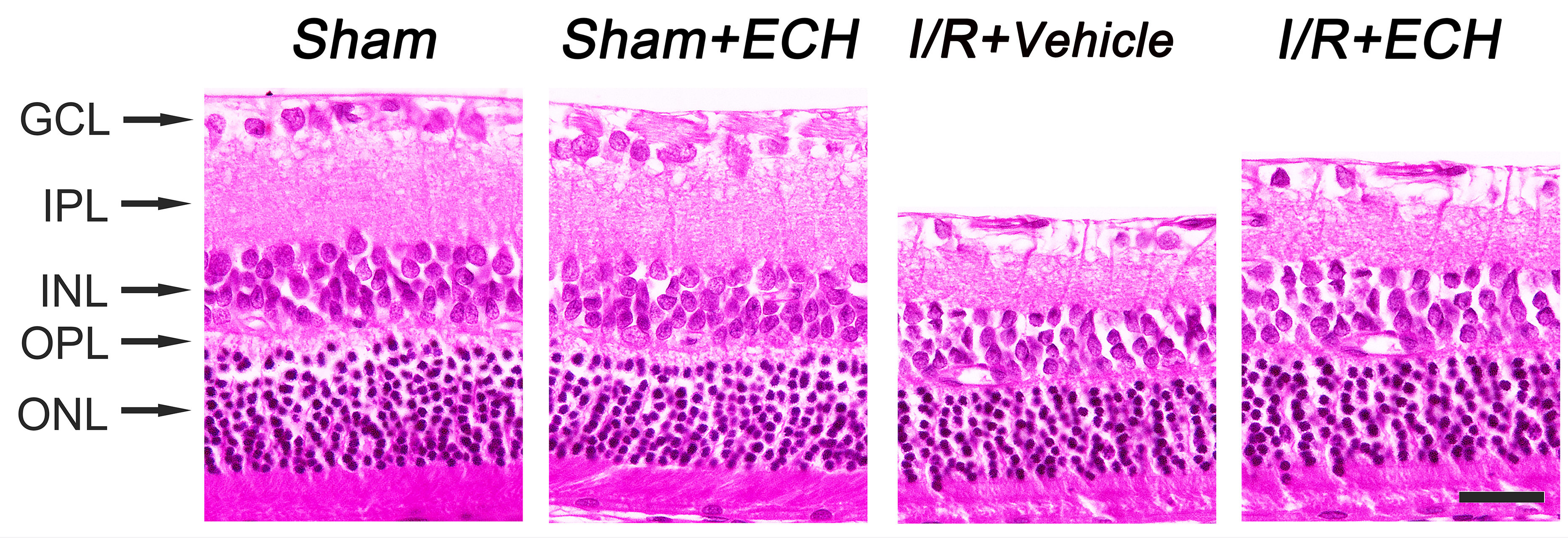 the number of GCL cells had decreased, whereas in the I/R plus ECH group, the retina was more normal in structure, with a