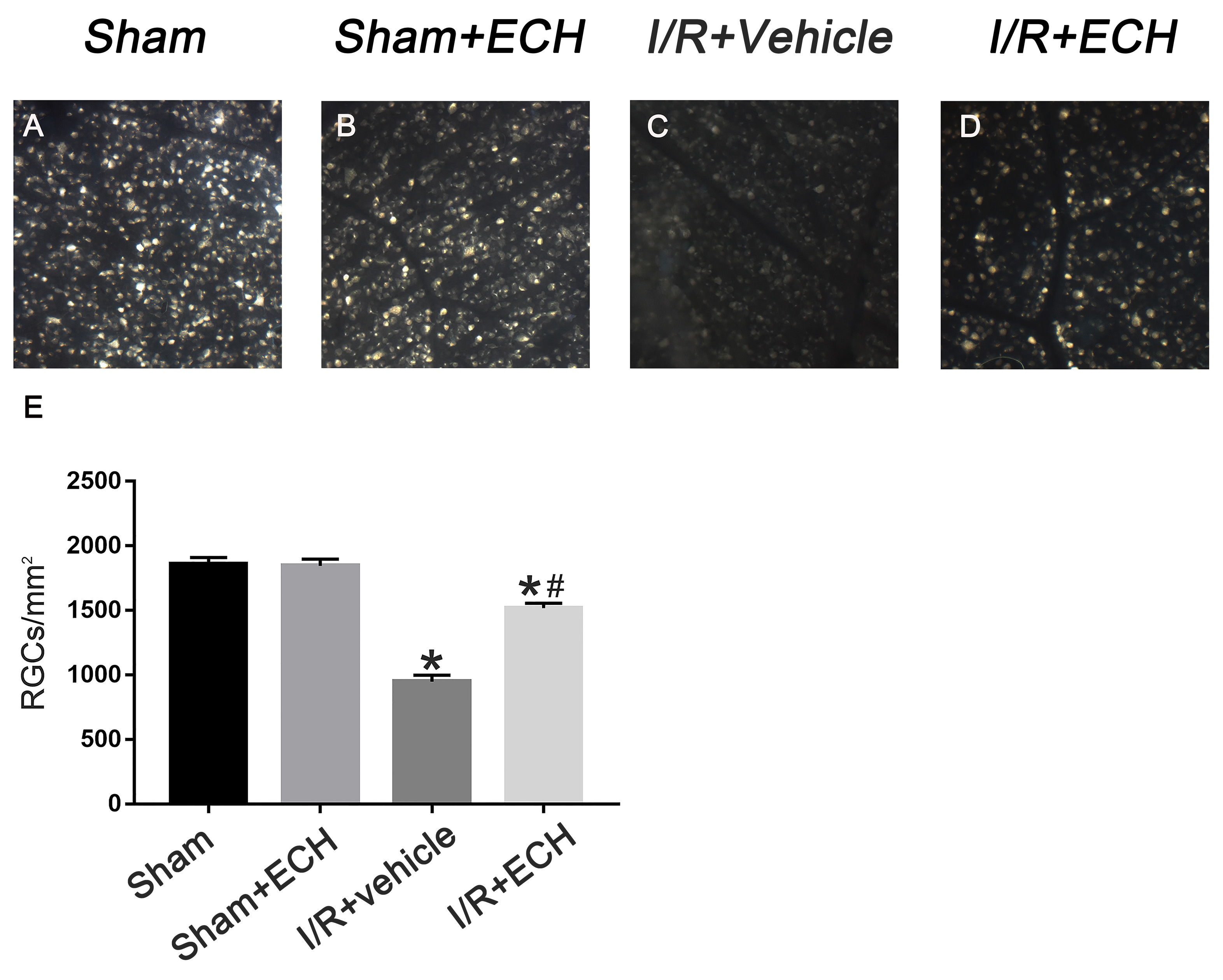 group. *p<0.05 versus sham group; #p<0.05 versus I/R plus vehicle group. E: The bar graph represents the total number of RGCs in all groups. There was a statistically significant loss, an approximate