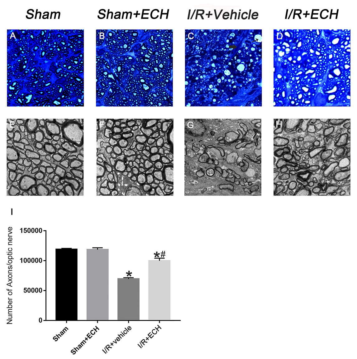 E, F: Optic nerves show an orderly arrangement of the myelin sheath in the axons in the sham group and the I/R plus ECH group.