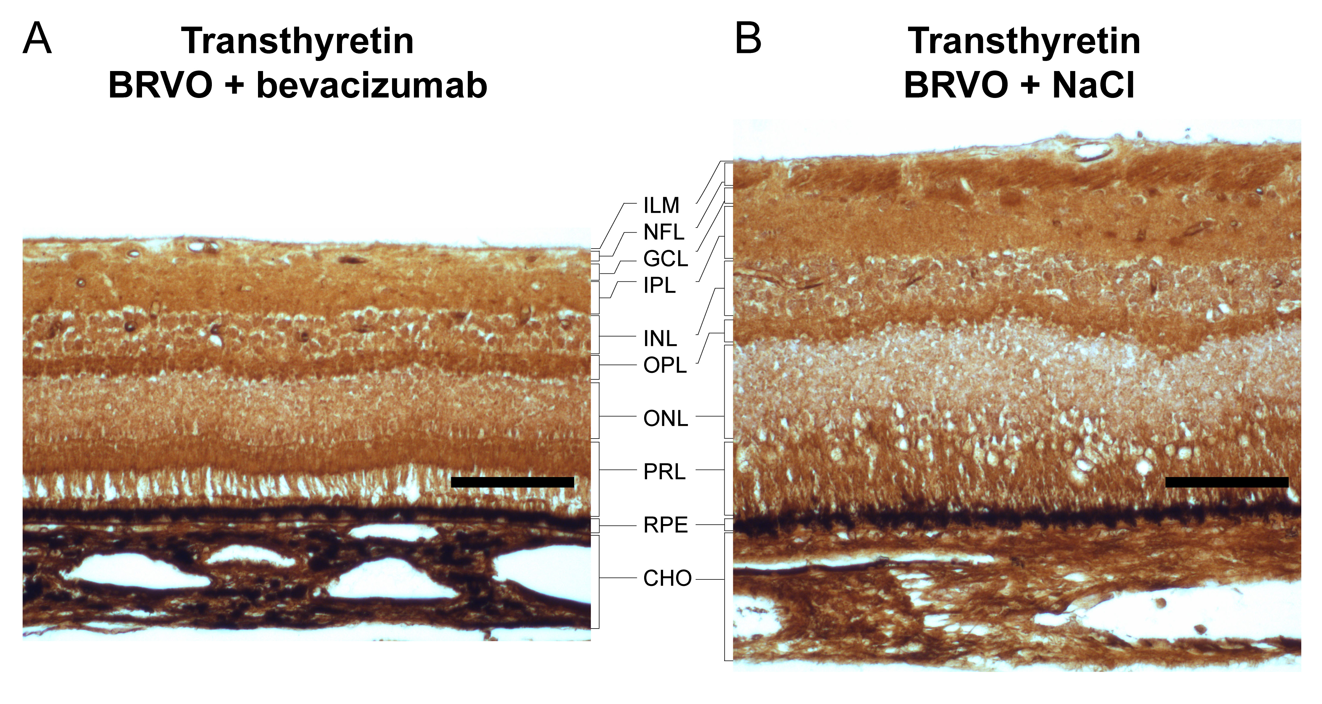 In the choroid, the reaction for TTR was stronger in BRVO with bevacizumab intervention (A) compared to BRVO without bevacizumab intervention (B). Therefore, the choroid may be the source of increased TTR in BRVO with bevacizumab intervention. Scale bar = 50 µm. Reaction