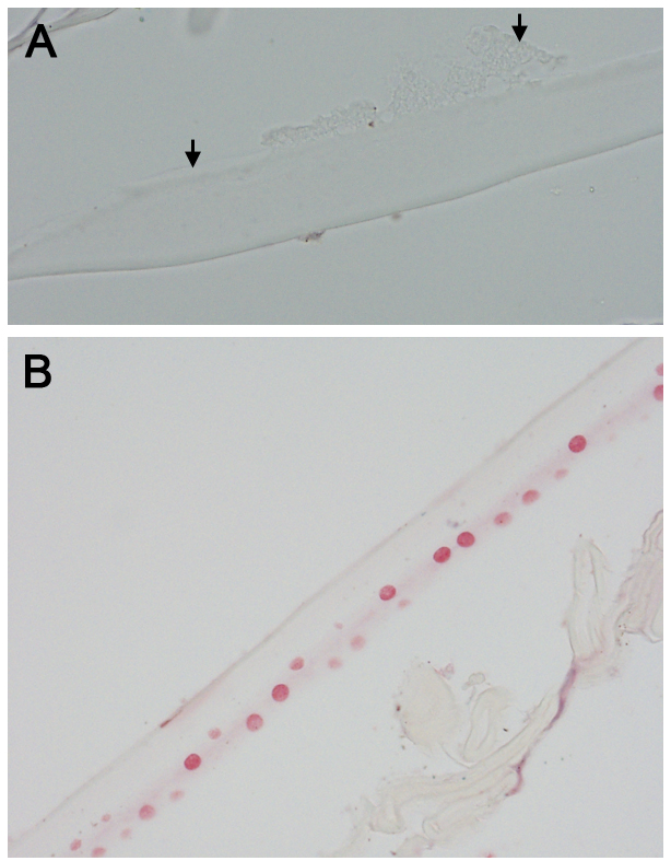 Figure 2. Presence of iron-free hemoglobin in PEX material and lens epithelium. Sections of (A) pseudoexfoliation (PEX)-affected and (B) unaffected lens capsules were stained with Perls’ Prussian blue and imaged in bright-field at 60X original magnification.