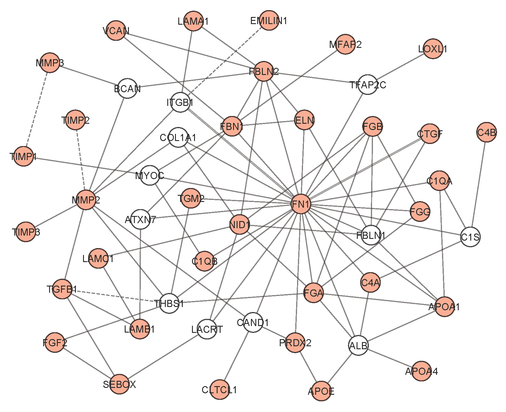 is shown. Genes and proteins implicated in pseudoexfoliation (PEX) syndrome are in red; solid line = protein–protein interaction;
