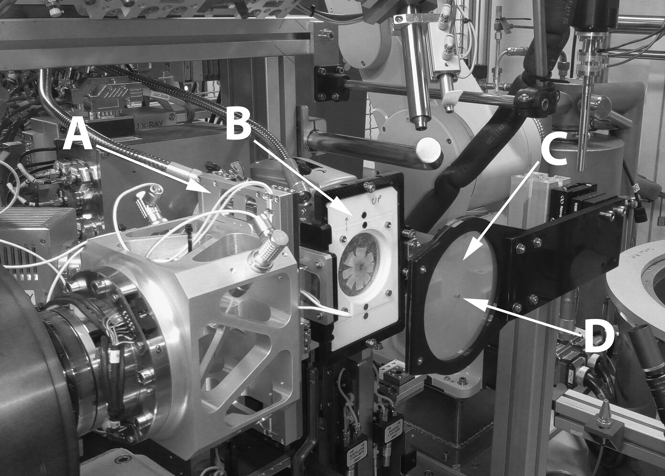 an additional Mylar sheet (C) in which a lead beam stop (D) is attached prevents undiffracted X-rays from reaching and damaging the detector positioned out of shot.