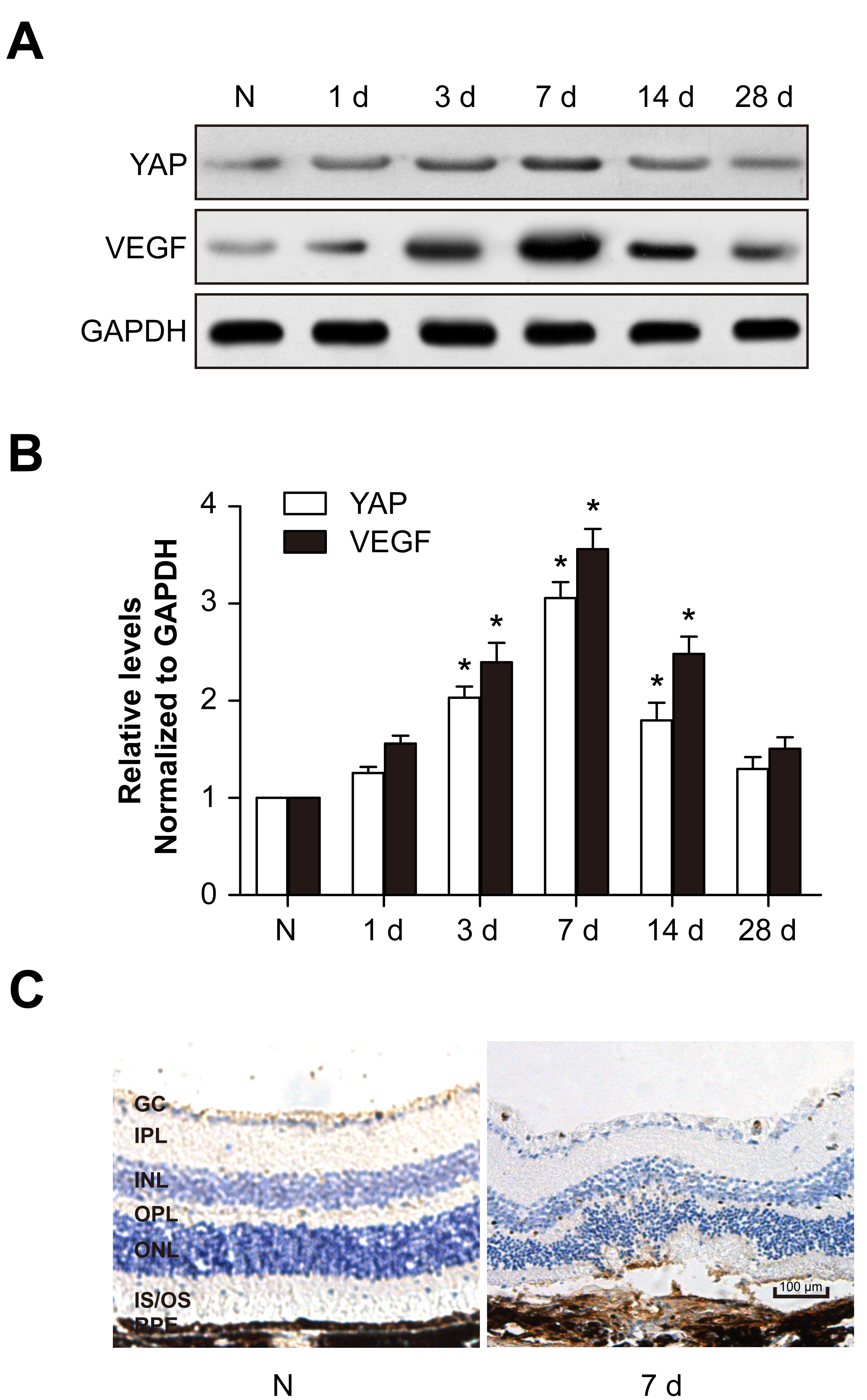to normal controls. C: Immunohistochemistry of YAP in the normal and 7 day post-laser photocoagulation groups.