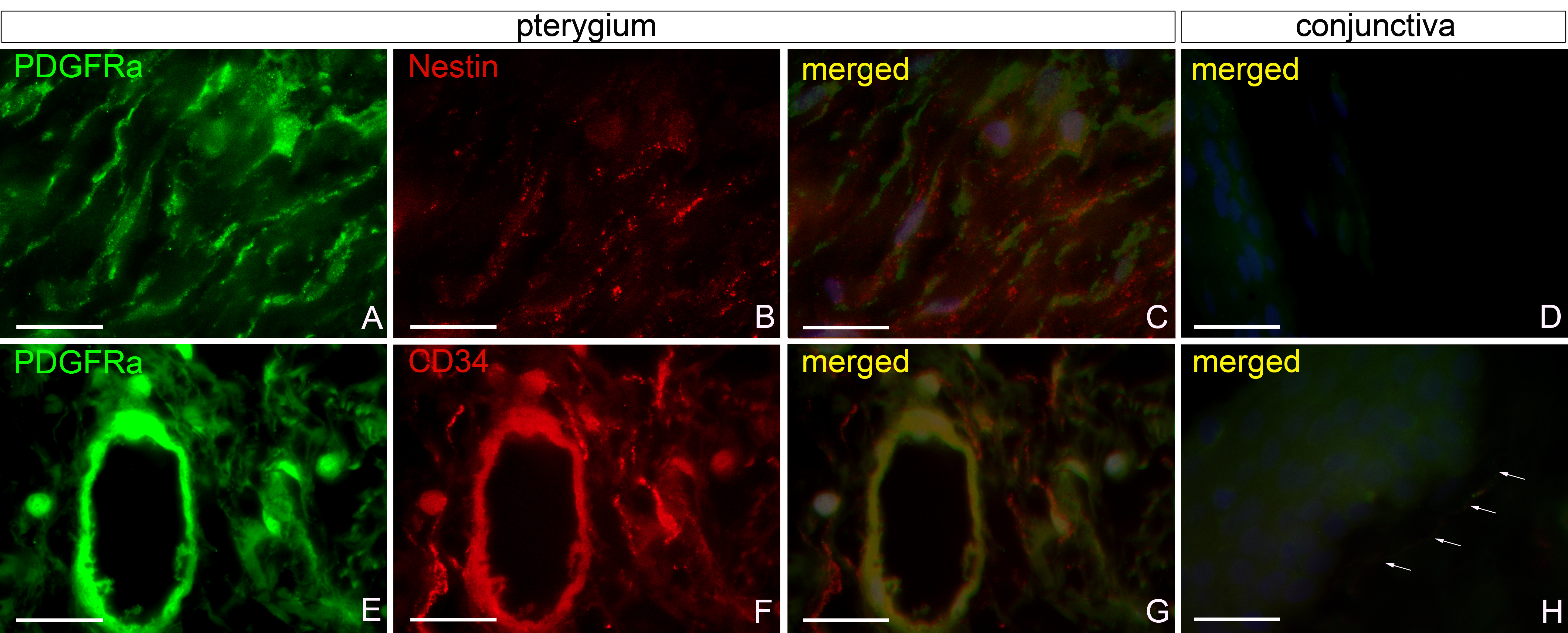 (C) and PDGFRα and CD34 (G) in pterygium stromal telocytes was observed. Nestin was always expressed in a punctate/granular pattern (B,C). The scattered conjunctival stromal TCs always showed a PDGFRα+/nestin- (D) and PDGFRα+/CD34+ (H, arrows) immunophenotype. Nuclei (blue) are counterstained with 4′,6-diamidino-2-phenylindole (DAPI). Scale bar: A–H = 125 µm.