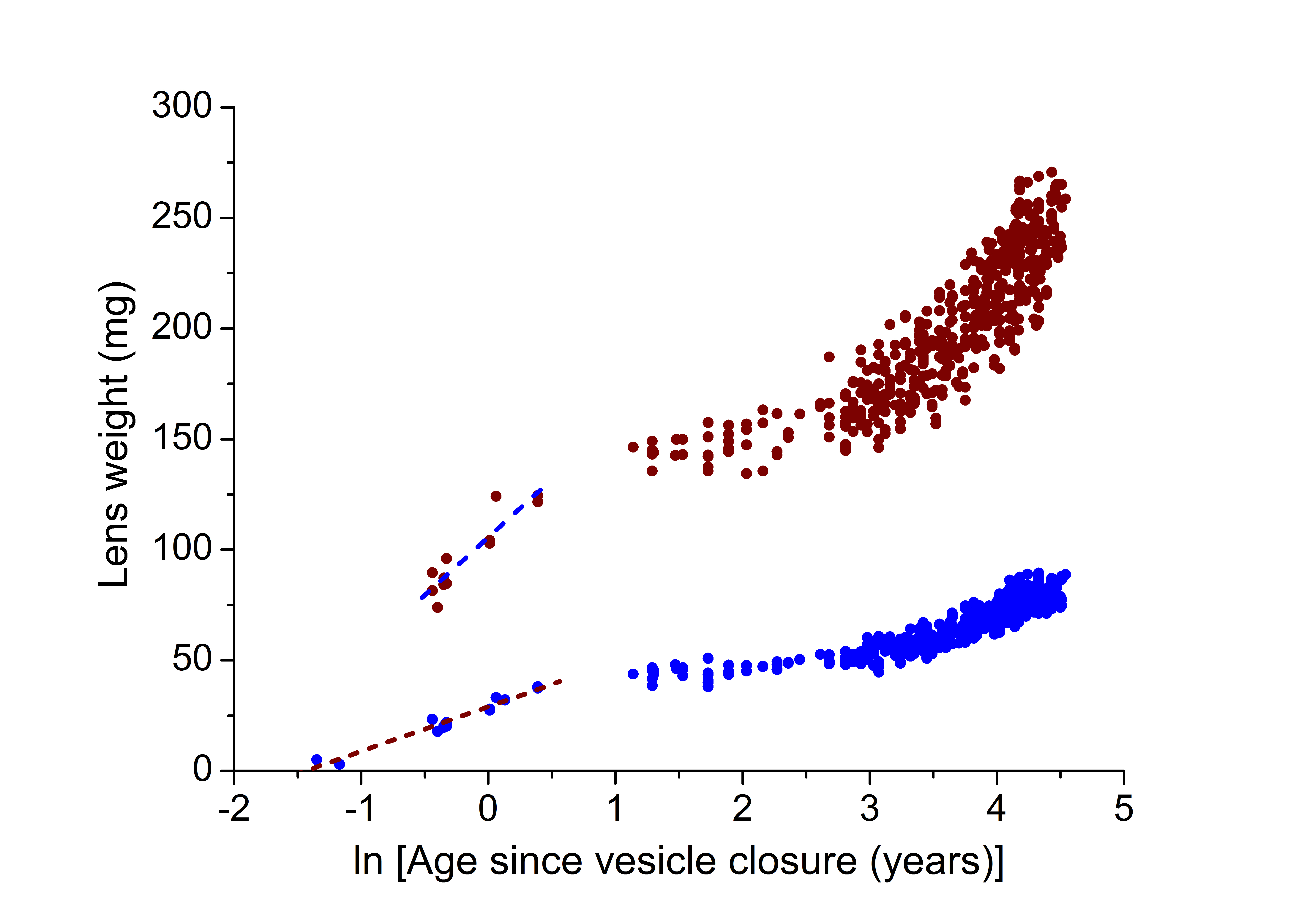 Figure 4. Semilogarithmic analyses of lens Wet (brown symbols) and Dry (blue symbols) weights as a function of age. Regression analysis