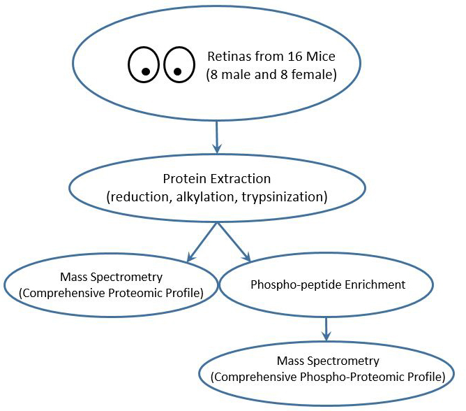 Figure 2. Simplified comprehensive proteome and phosphoproteome workflow: Retinas from 16 ND4 Swiss Webster mice (eight males and eight