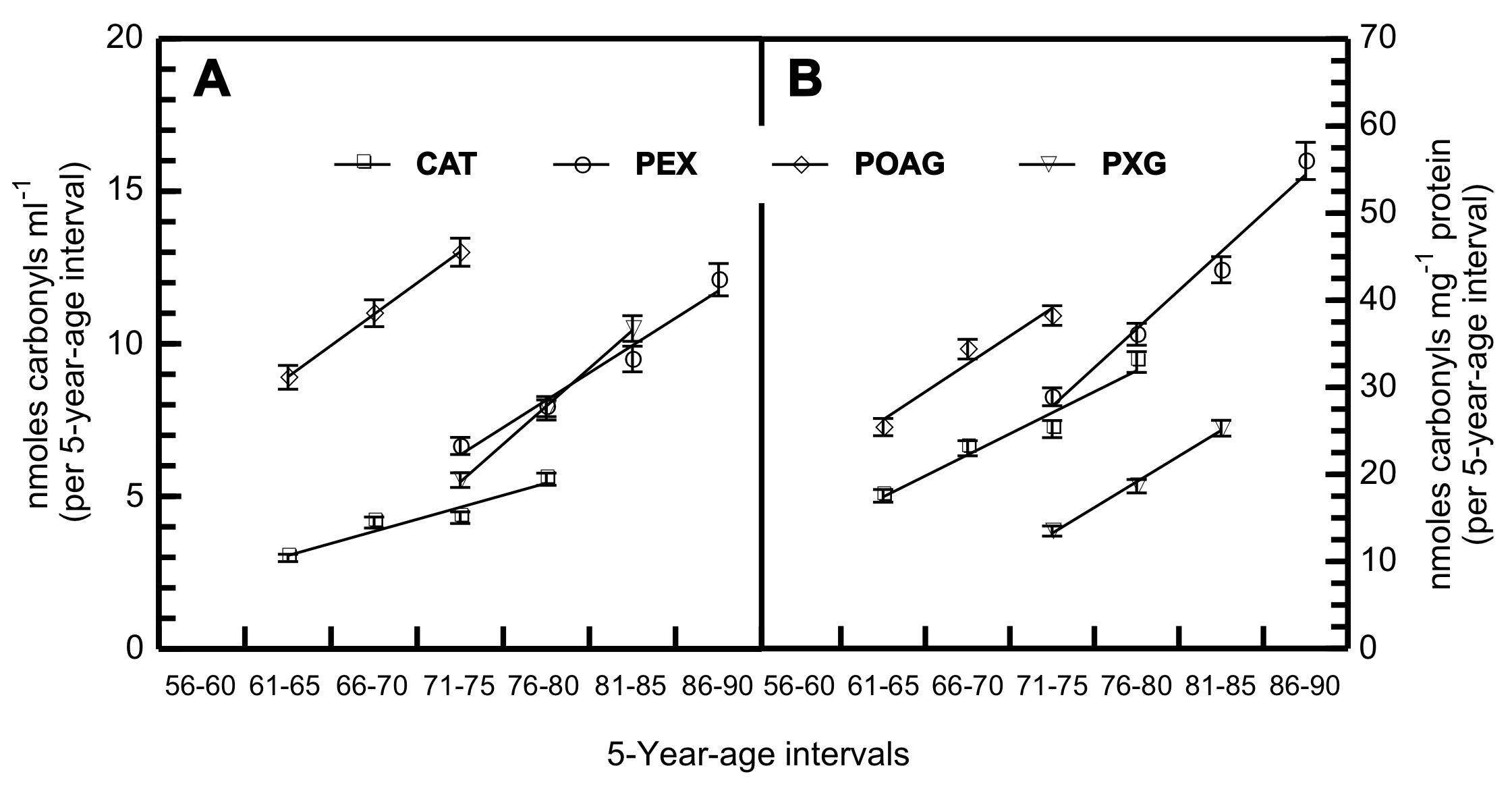 change (rate) in the protein carbonyl concentration (nmoles ml−1 and mg−1 in A and B, respectively) versus the patient’s 5-year age intervals. Data are presented as mean ± standard error of the mean (SEM).