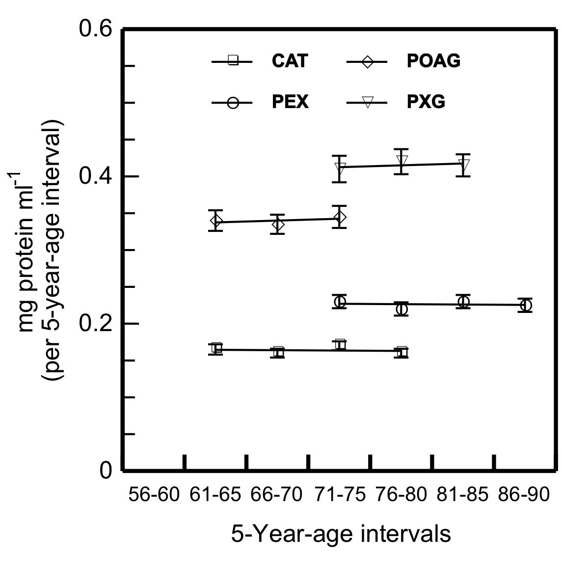 Figure 3. Age-related association of protein concentration in AH. The association is expressed as the protein concentration (mg ml−1) versus the patient’s 5-year age intervals. Note that the straight lines are nearly horizontal, and the corresponding slopes