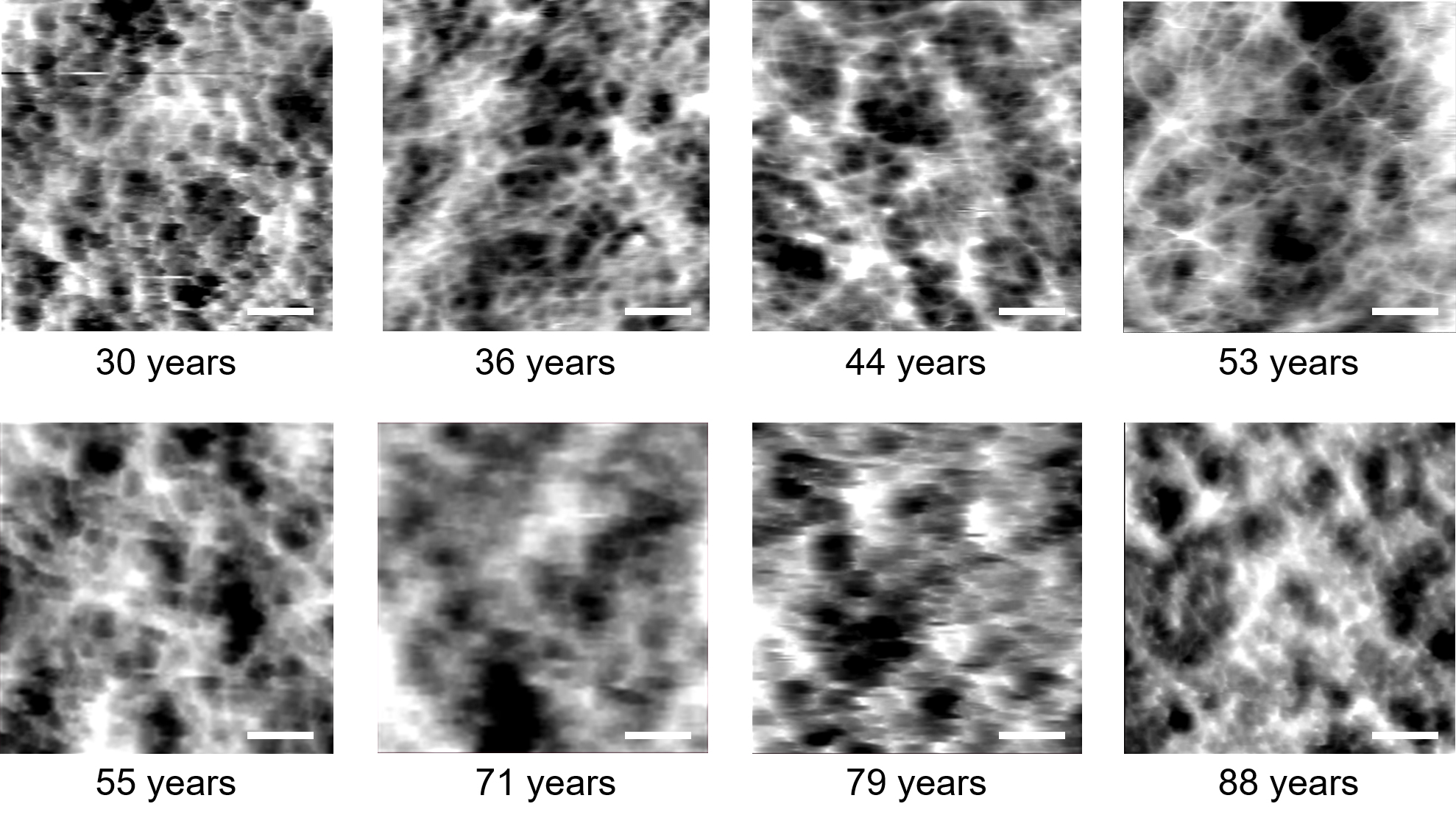 Atomic force microscopy (AFM) images of the human lens capsule surfaces from the eight human donors. All images’ dimensions are 5 × 5 µm and were obtained from the Z sensor channel. The scale bar represents 1 µm.