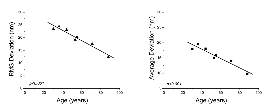 Root mean square (RMS) and average deviation roughness as a function of age. The surface of the human lens capsule becomes significantly smoother with age.
