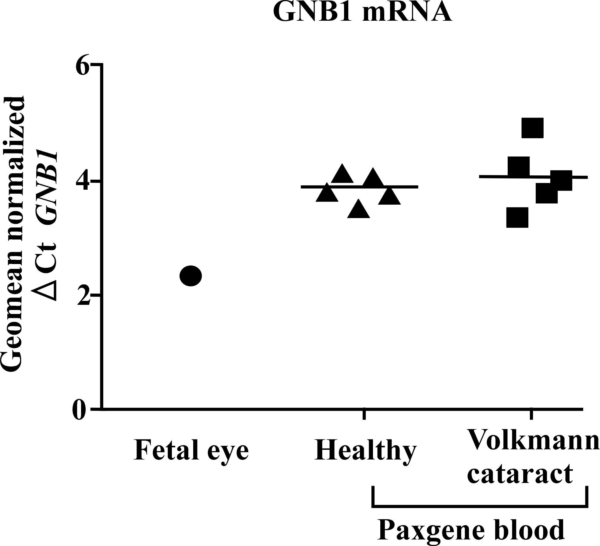 qPCR of GNB1 using cDNA made from RNA isolated from fetal eye, and whole blood from five healthy individuals and five heterozygote mutant carriers. To access the data, click or select the words “Appendix 6.”