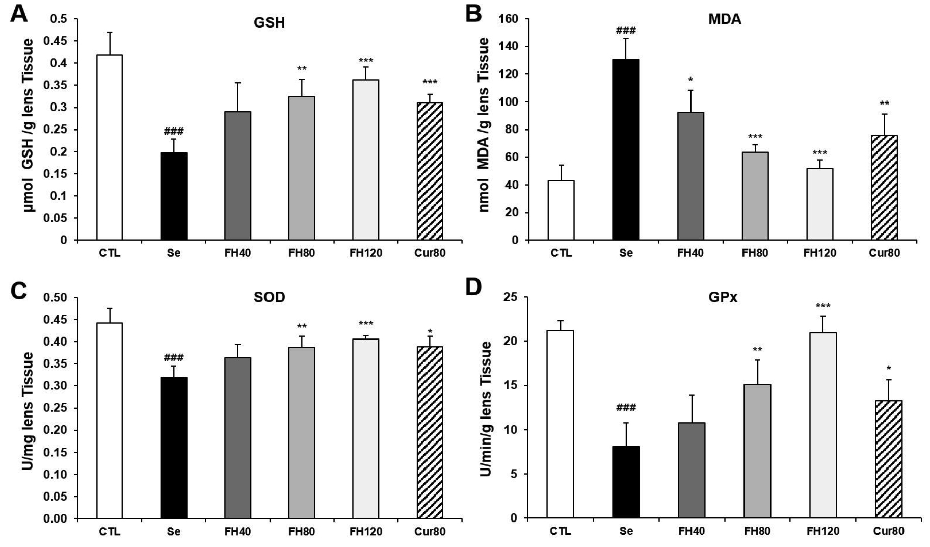 Figure 4. Effects of FH on GSH, MDA, SOD, and GPx in the lens. We measured the (A) glutathione (GSH), (B) malondialdehyde (MDA), (C) superoxide dismutase (SOD), and (D) glutathione peroxidase (GPx) levels to find antioxidant effects of FH in the lens. Each value represents the mean ± standard