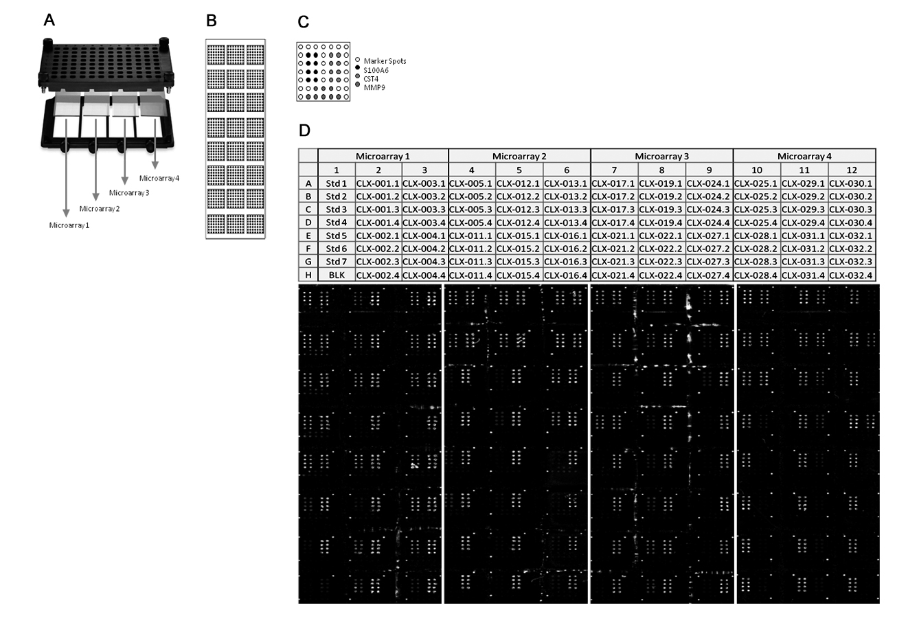 Figure 1. Antibody microarrays customized. A: Specific device for analyzing four microarrays simultaneously. B,C: Spotting pattern for the 24-subarray format. D: Representative image of the arrays showing the distribution of the standard calibration curve and samples. Only one microarray