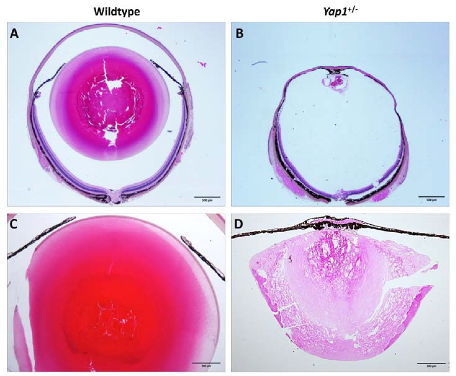 a collapsed anterior chamber, and aphakia in age-matched male Yap1+/− mice at 2 weeks old, 2 months old, and 1 year old. A small lens and a deep anterior chamber were identified in the left eye