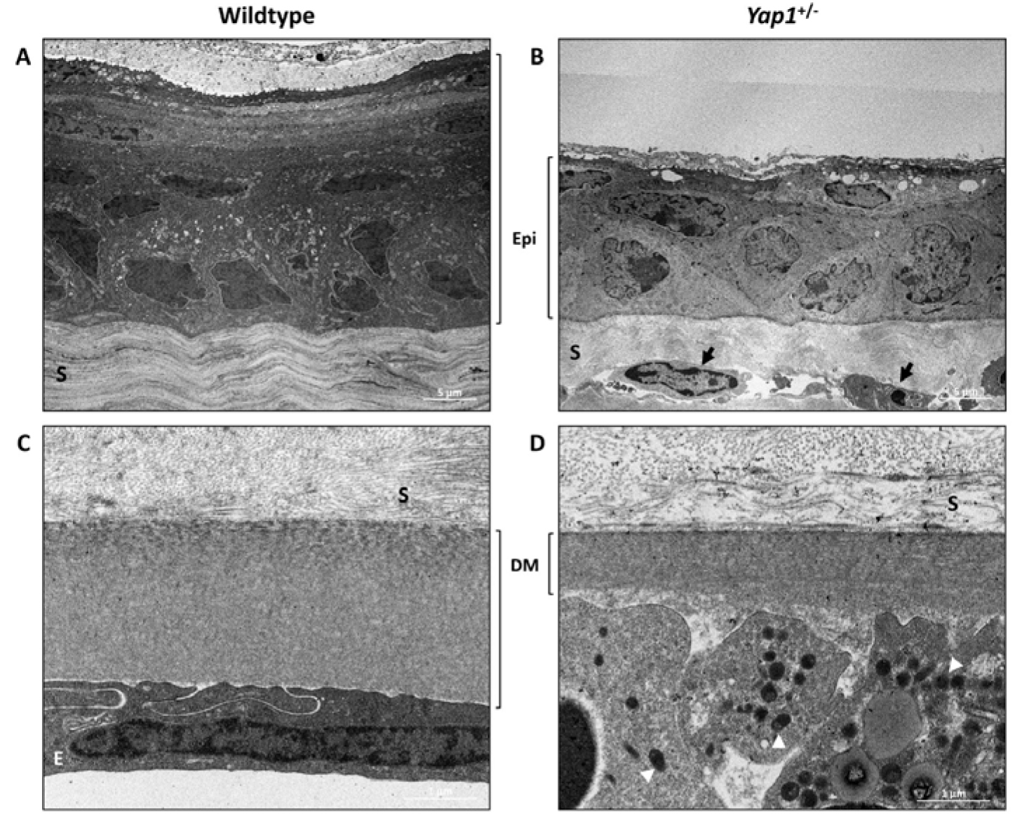 membrane in the WT mice. D: The Yap1+/− mice lacked a normal endothelium that was replaced by cuboidal melanocytes containing numerous pigment granules (melanin;