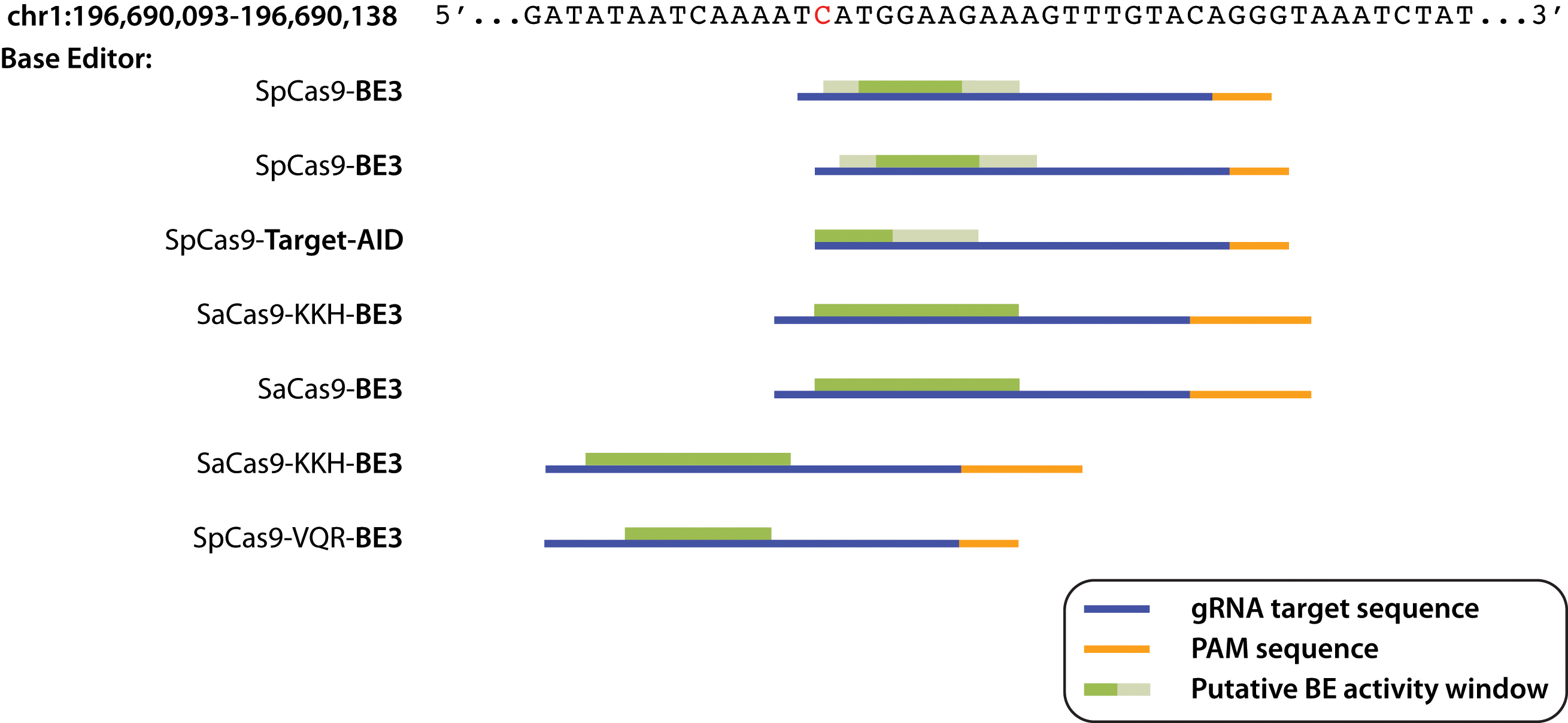 gRNA target sequences are shown in orange and blue, respectively. Putative base editor activity windows are displayed in green,