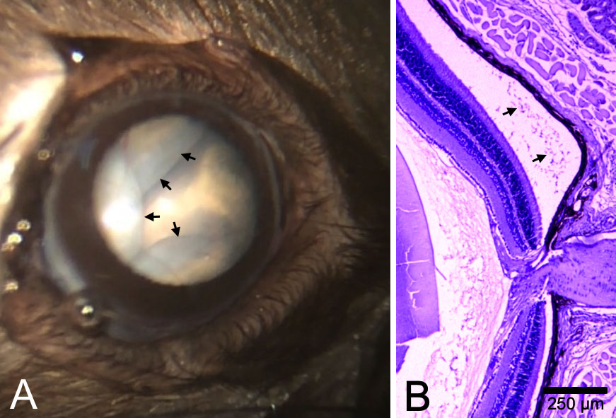 detachment extensions). B: Separation between the neuroretina and retinal pigment epithelium in the superior temporal quadrant of the eye (subretinal
